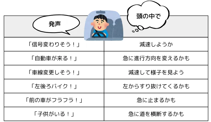 と、自分が何を見て、何を考えて、どう判断しているかを声に出して確認するという運転方法です。