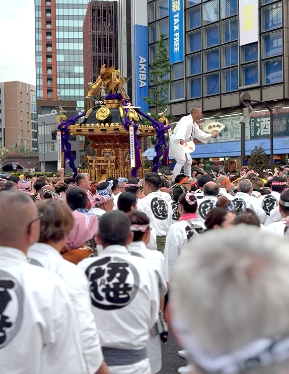 朝7時から集合して行われた神輿宮入では、秋葉原の駅から大通りを抜け神田明神まで数回の小休憩を挟みつつ練り歩きました。