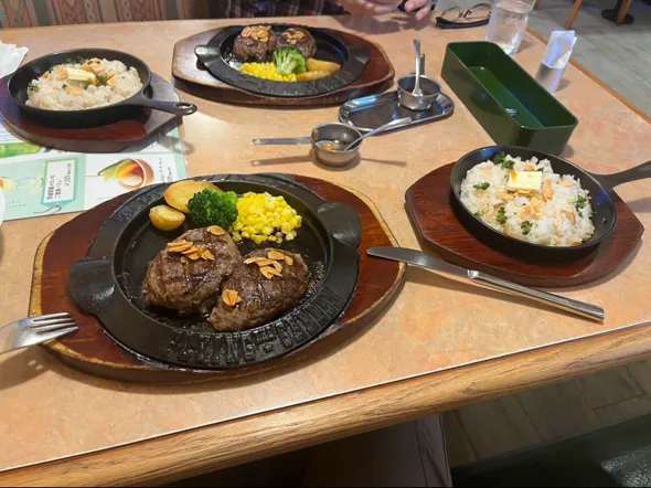 爆弾ハンバーグでおなじみフライングガーデンにて、ハンバーグとガーリックライスをチョイス。