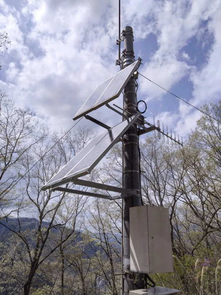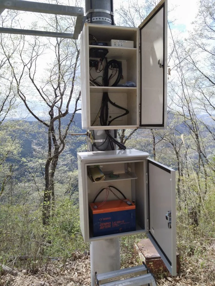 山頂では電源がないため、ソーラーシステムで電源供給しています。