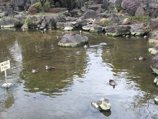 日本庭園の池にはカルガモやマガモが餌もらいに集まっています。