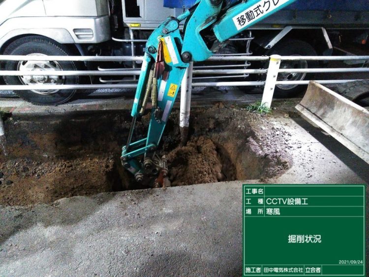 カメラ映像は光ケーブルにて伝送しますので、近くの情報ボックスまで通線しますが、ほぼ埋設管路が無いので、道路や歩道を掘削して埋設用配管を埋め込んだ後、光ケーブルを敷設します。