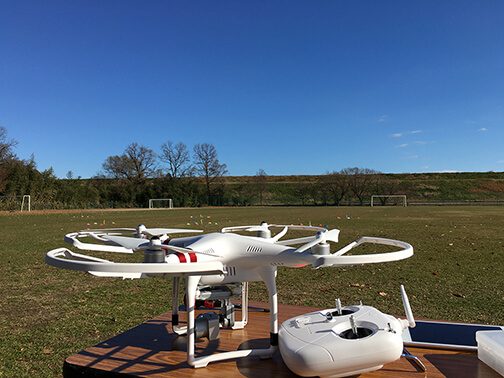 グランドでの操作についてですが、基本的に撮影などで使われる高価なドローンはカーナビなどに使われているGPSの機能を使い、風により流されてしまう動きを制御できる為、その場にとどまり安定した飛行ができます。