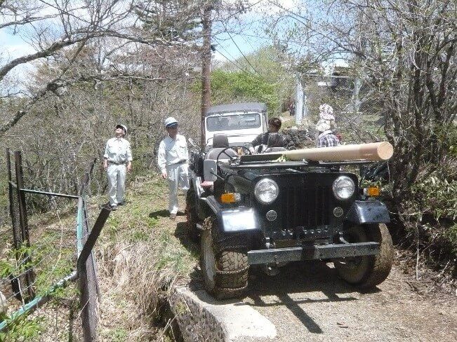 いざ工事開始!機材搬入はジープにて現場まで運んでくれます。