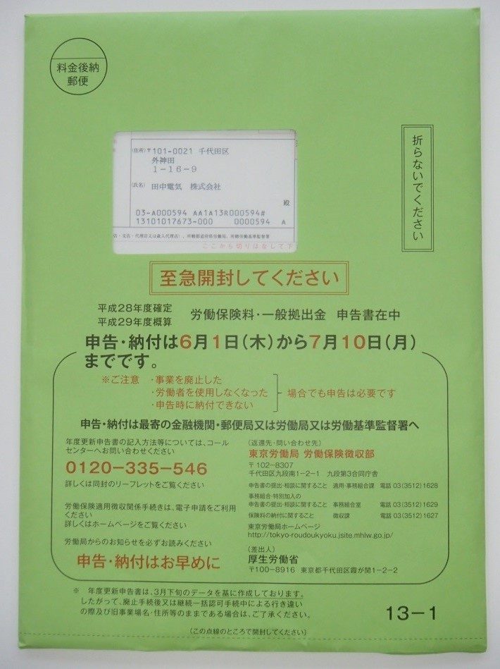 自動車保険でも「保険料見直し」のCMがありますように、「労働保険」もこの時期に保険料を見直し、7月10日までに保険料が収められるように手続きをします。