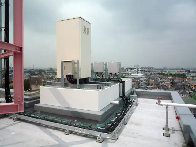 マンションの住民の方との入念な事前打ち合わせを行い、屋上に携帯電話無線機基地局を設置