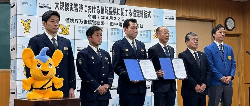 2025年4月22日(火)に警視庁万世橋警察署と田中電気株式会社は、暴風・豪雨・豪雪・洪水・高潮・地震・津波などの異常気象や大規模災害の発生時において、田中電気の所有するドローンを使い周囲の被災状況を確認し、万世橋警察署へ情報提供を行うための協定「大規模災害時における情報提供に関する協定」を締結しました。