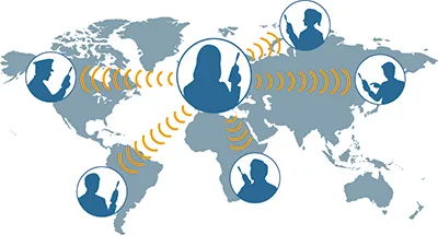 衛星電話とは異なり、送信(PTT)ボタンを押すだけで同時に複数の相手に音声を送ることができます。