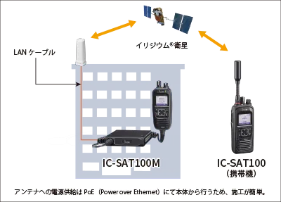 IC-SAT100Mは、アンテナユニットを建物の屋上などに設置することで、屋内や車内、地下など衛星に電波が届かない場所からでも衛星通信が可能です。