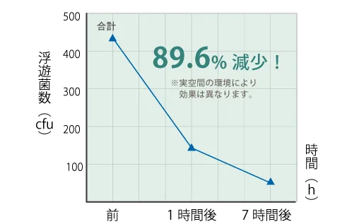 「エアロシールド」は第三者研究機関の実証試験により、「実空間における浮遊菌減少が89.6%」と結果を得ています。