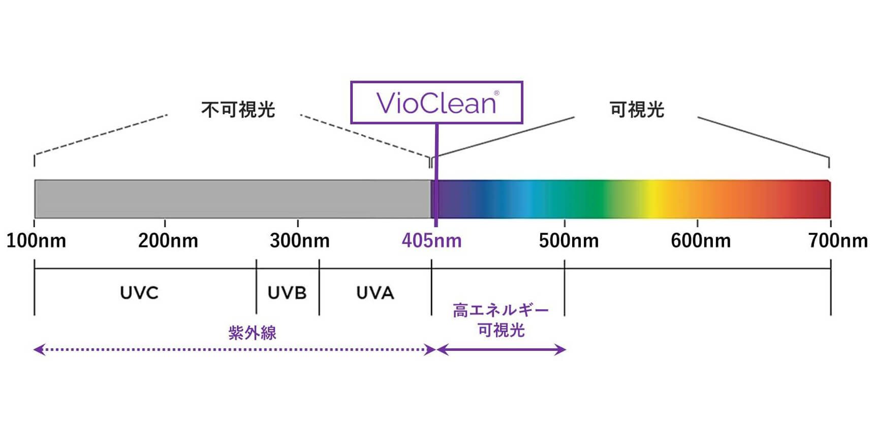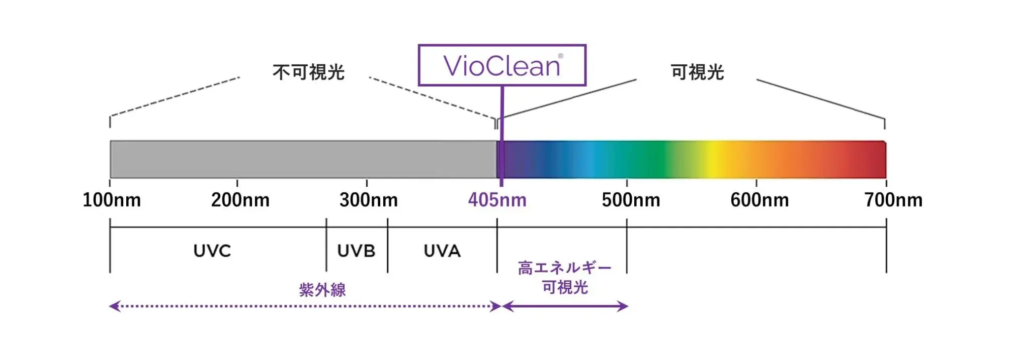 VioClean®は不可視光のUV除菌ライトと異なり、普通可視光の中の特定波長(405nm)を用いています。