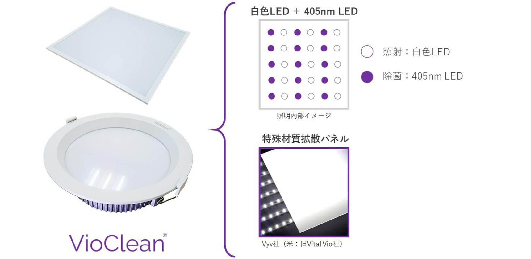 米Vyv Inc.(旧Vital Vio社)の特許除菌LED技術である白色LEDと、特殊材質拡散パネルを組み合わせる事で、高い光透過率の上に除菌エネルギーの流失を防ぎ、通常の自然な白い光に見せています。