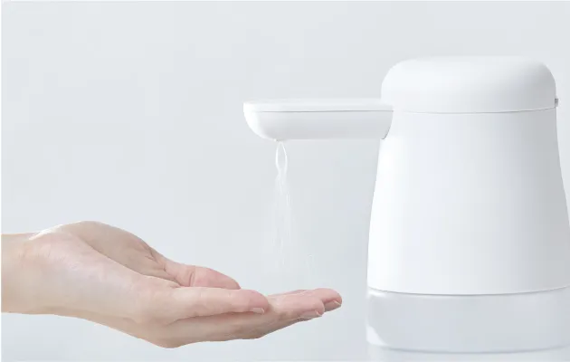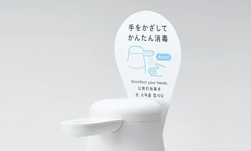 手をかざすとセンサーが感知して消毒液が噴射するので本体に触れることく清潔に消毒することができます。