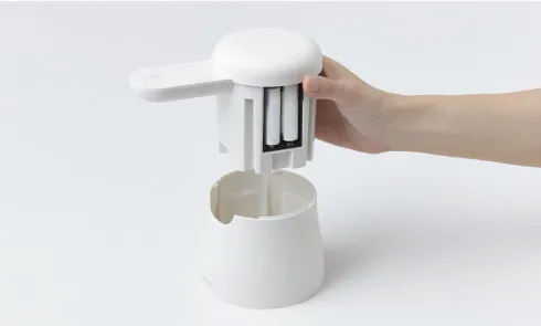 ボトルから本体をはずし、本体カバーをずらすだけで簡単に電池交換できます。工具は一切必要ありません。