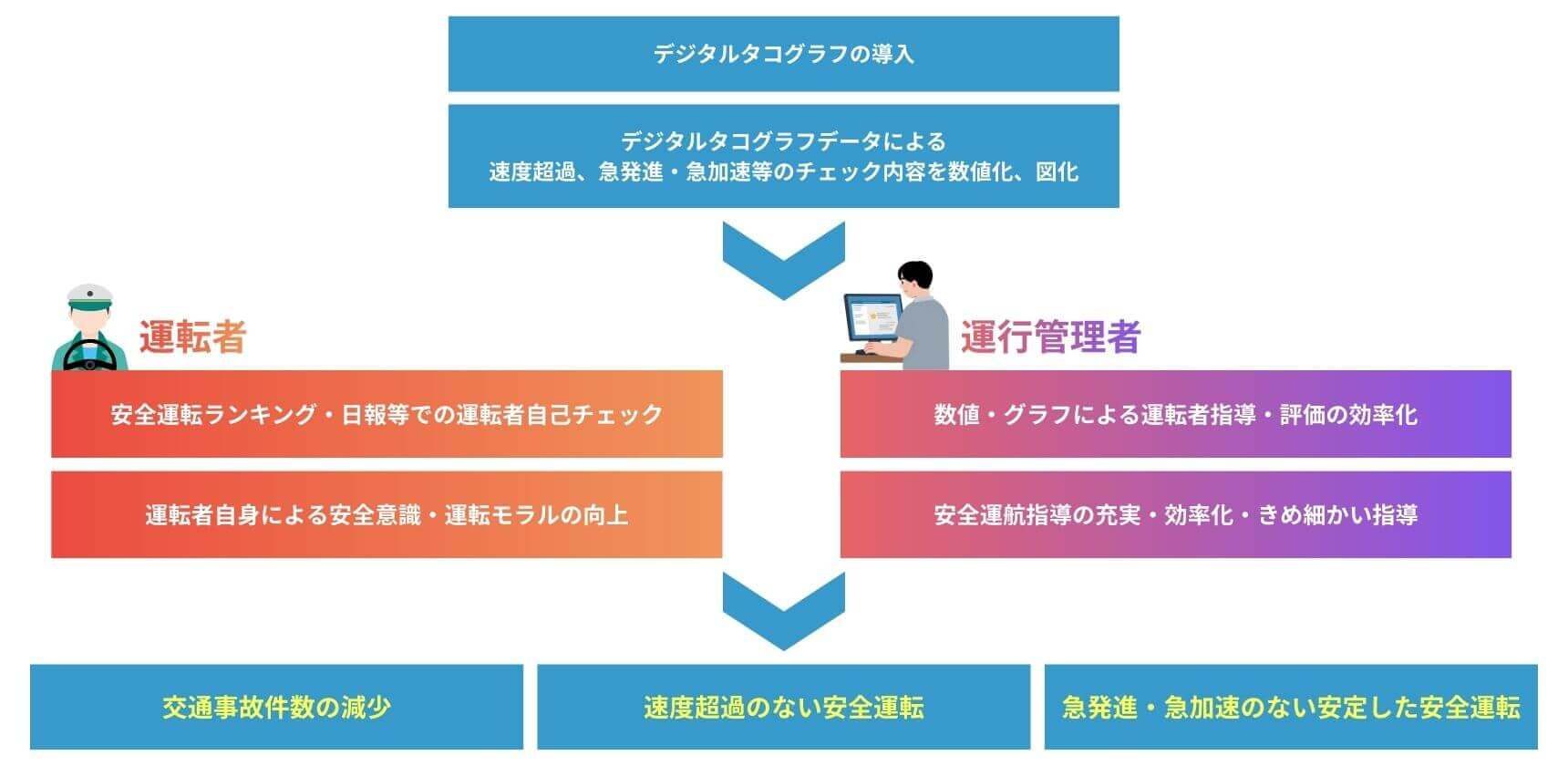 デジタルタコグラフのデータと利用ソフト(読み取り装置)を活用することは、短時間での判定によるタイムリーな運転者の指導や自己分析ができる等、普段の運行管理の実効性をさらに高める手段のひとつとなっています。