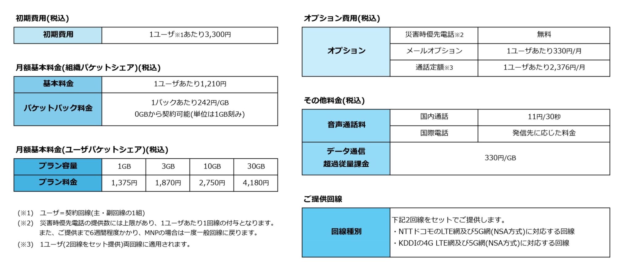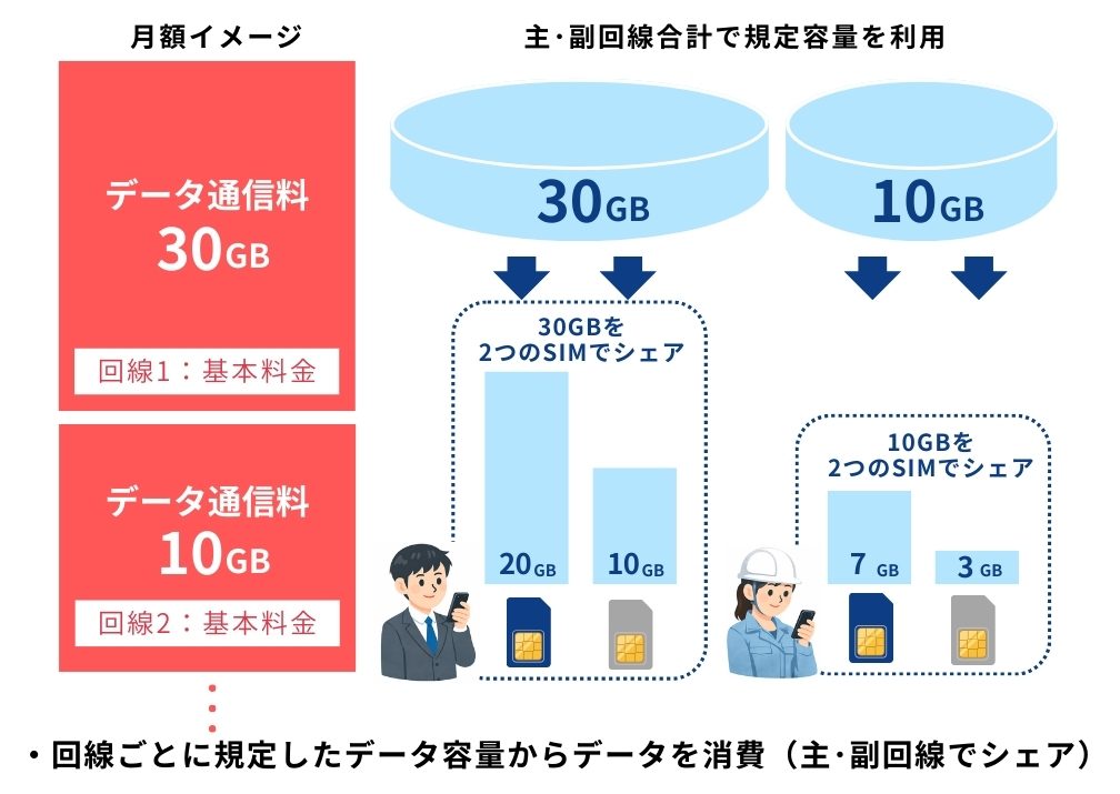 契約回線(主・副回線の1組)ごとにデータ容量を規定し、主回線と副回線でシェアするプラン