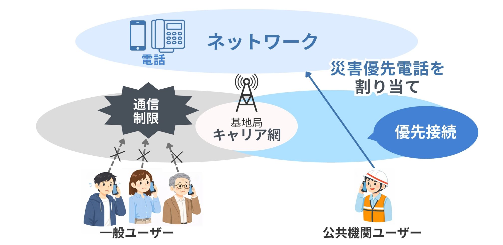 災害などで通信設備が混み合った場合、発信規制や通信規制などにより、通常の電話は接続が制限されることがありますが、災害時優先電話はこうした制限を受けずに発信を行えます。